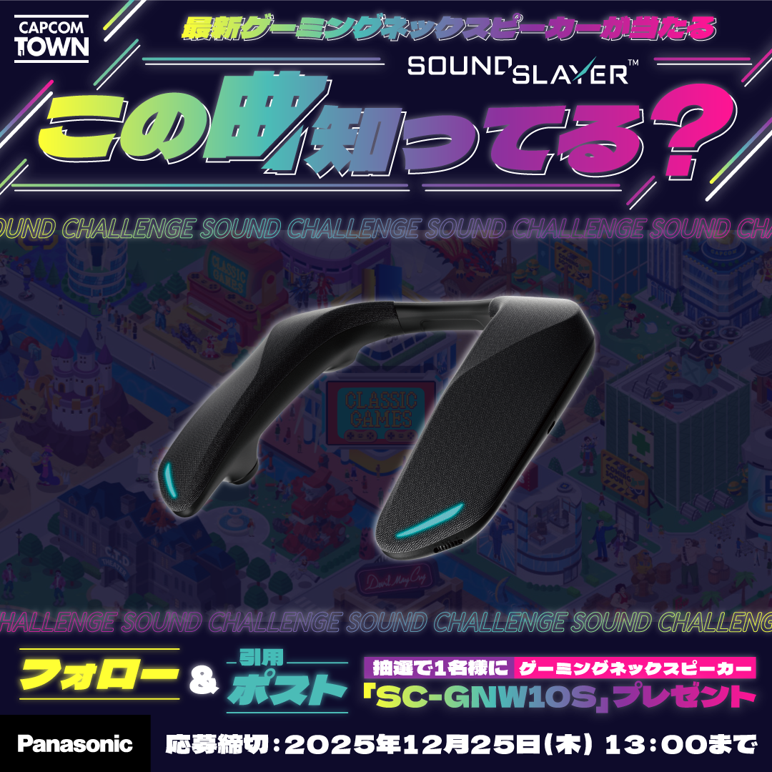 2025年12月17日(水)より「カプコンタウン」の公式Xアカウント(@capcomtown)にて、抽選1名様にパナソニック ゲーミングネックスピーカー「SC-GNW10S」が当たるフォロー&引用ポストキャンペーンを開催いたします。